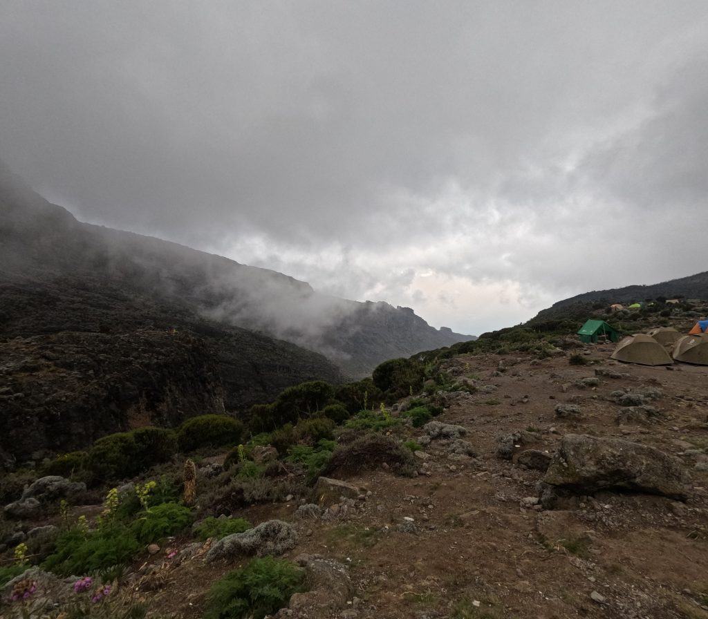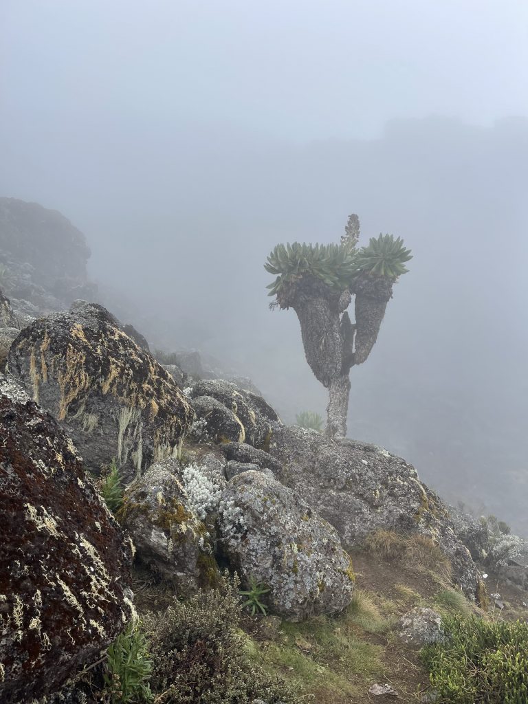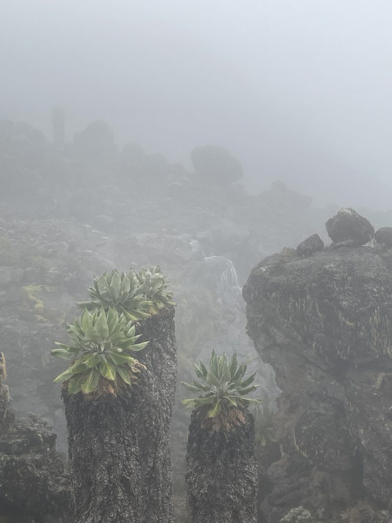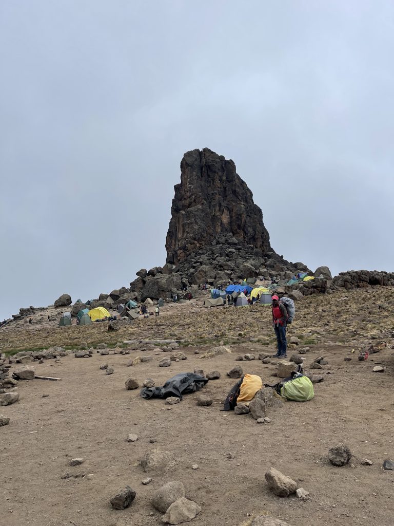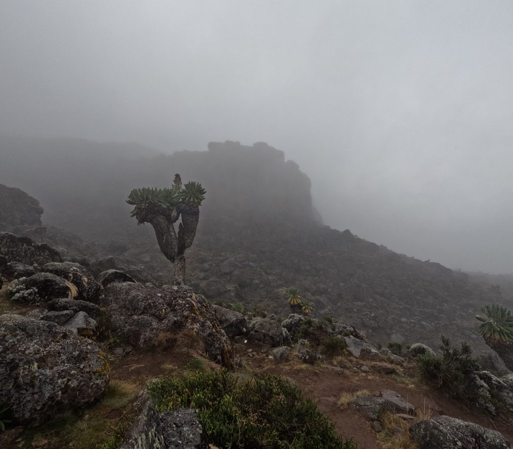 Now that we were in the clouds, we couldn’t see anything because Lava Tower was shrouded in fog. The fog suddenly lifts, revealing everything. The rock was tower-sized and enormous! At a height of 4630m, it is a sizable lava rock. Mount Kilimanjaro was once a triple volcano, and more than 150 000 years ago, volcanic activity caused the formation of the Lava Tower. Lava once erupted and cooled here, where the Lava Tower now stands. This hardened, preventing the lava beneath it from venting. Lava tower climbing was once possible, but for safety reasons, it was stopped.