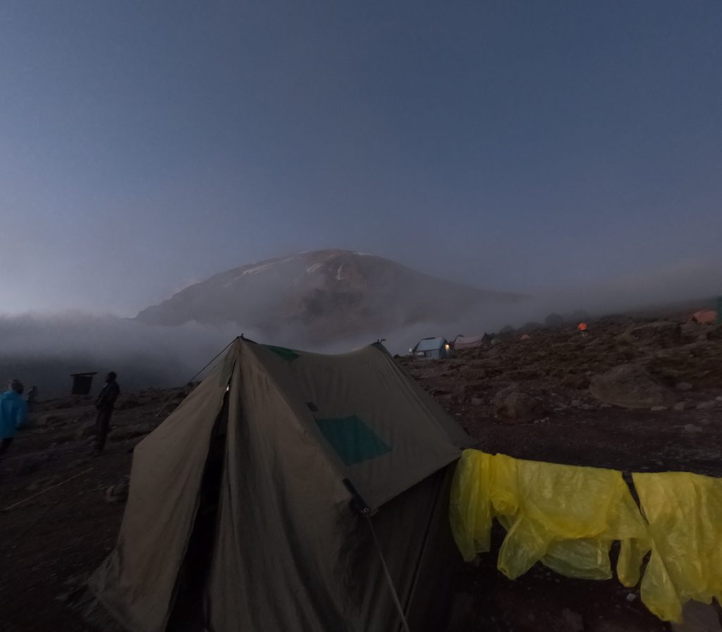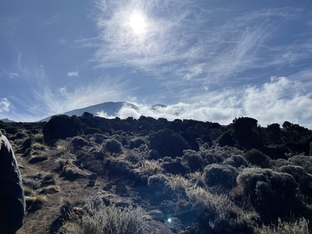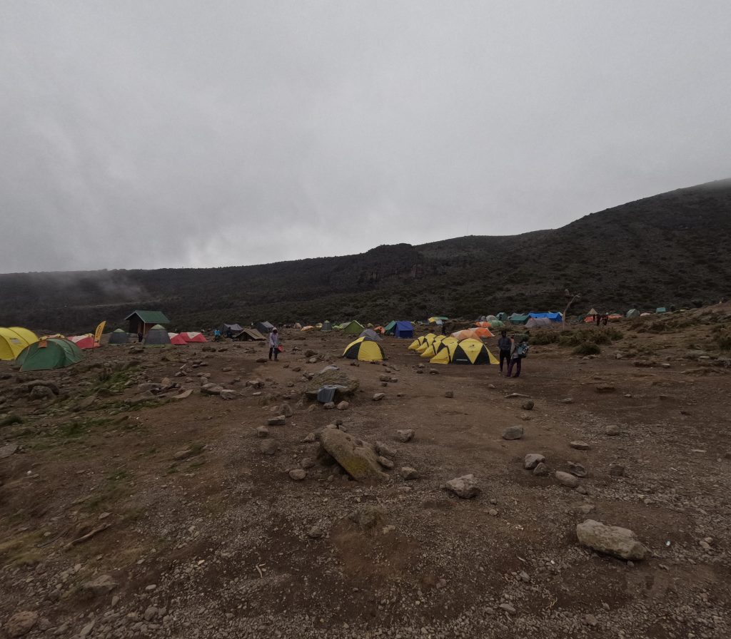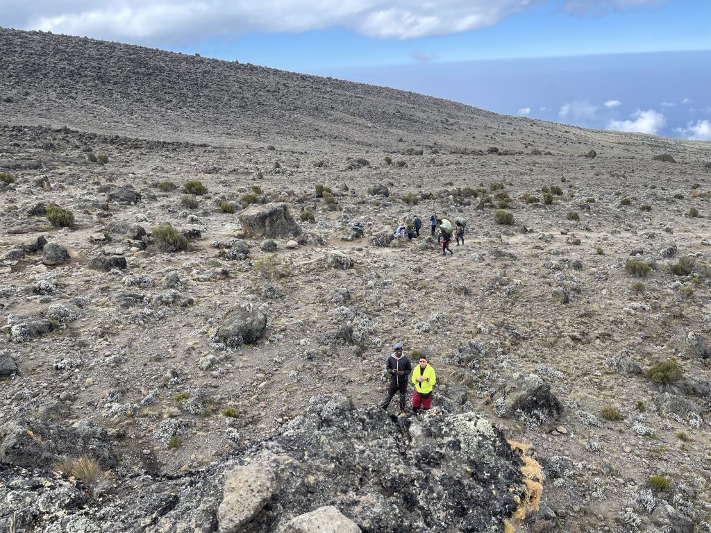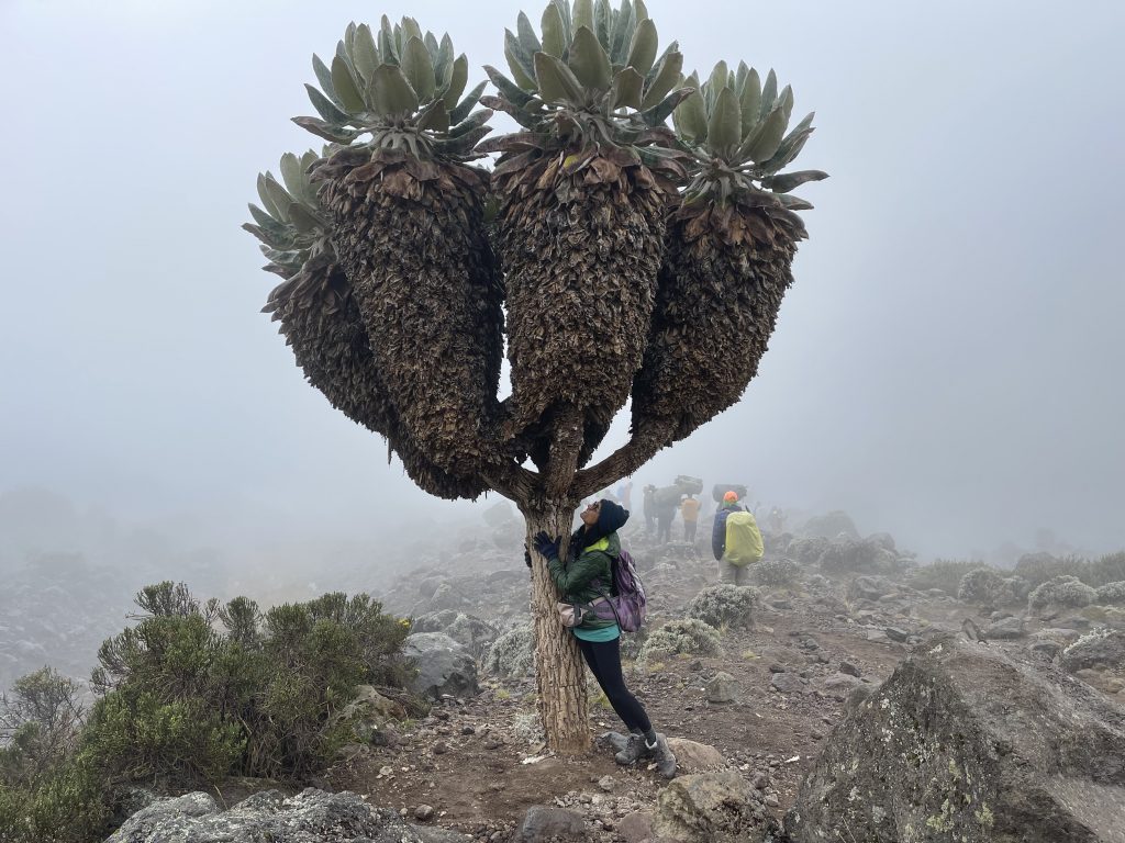 Now that we were in the clouds, we couldn’t see anything because Lava Tower was shrouded in fog. The fog suddenly lifts, revealing everything. The rock was tower-sized and enormous! At a height of 4630m, it is a sizable lava rock. Mount Kilimanjaro was once a triple volcano, and more than 150 000 years ago, volcanic activity caused the formation of the Lava Tower. Lava once erupted and cooled here, where the Lava Tower now stands. This hardened, preventing the lava beneath it from venting. Lava tower climbing was once possible, but for safety reasons, it was stopped.