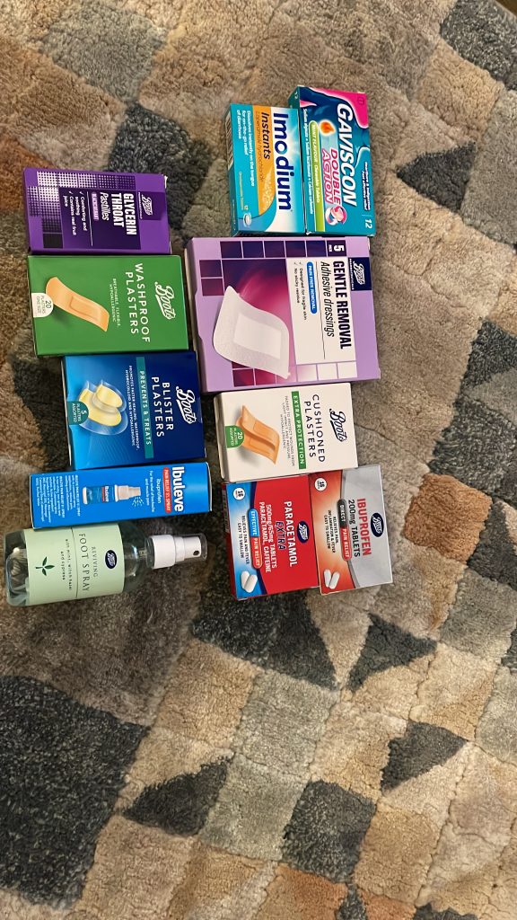 In the meantime – Amazon/sports shops, any shop ( where ever cheap) – merino socks, medicines, wipes, and toiletries packed in smaller containers for this trek. Lots and lots of good sunscreen.