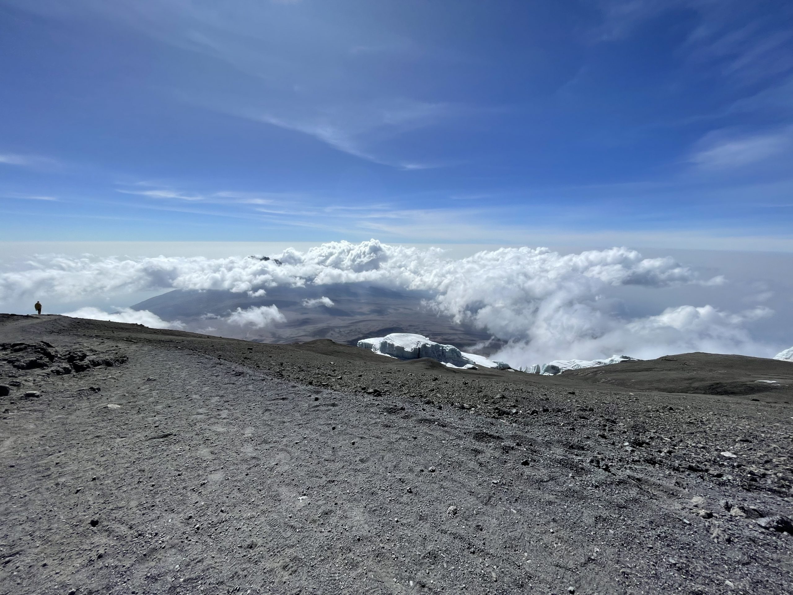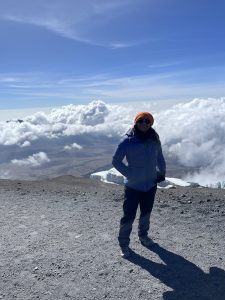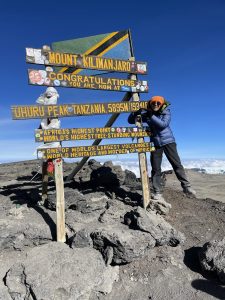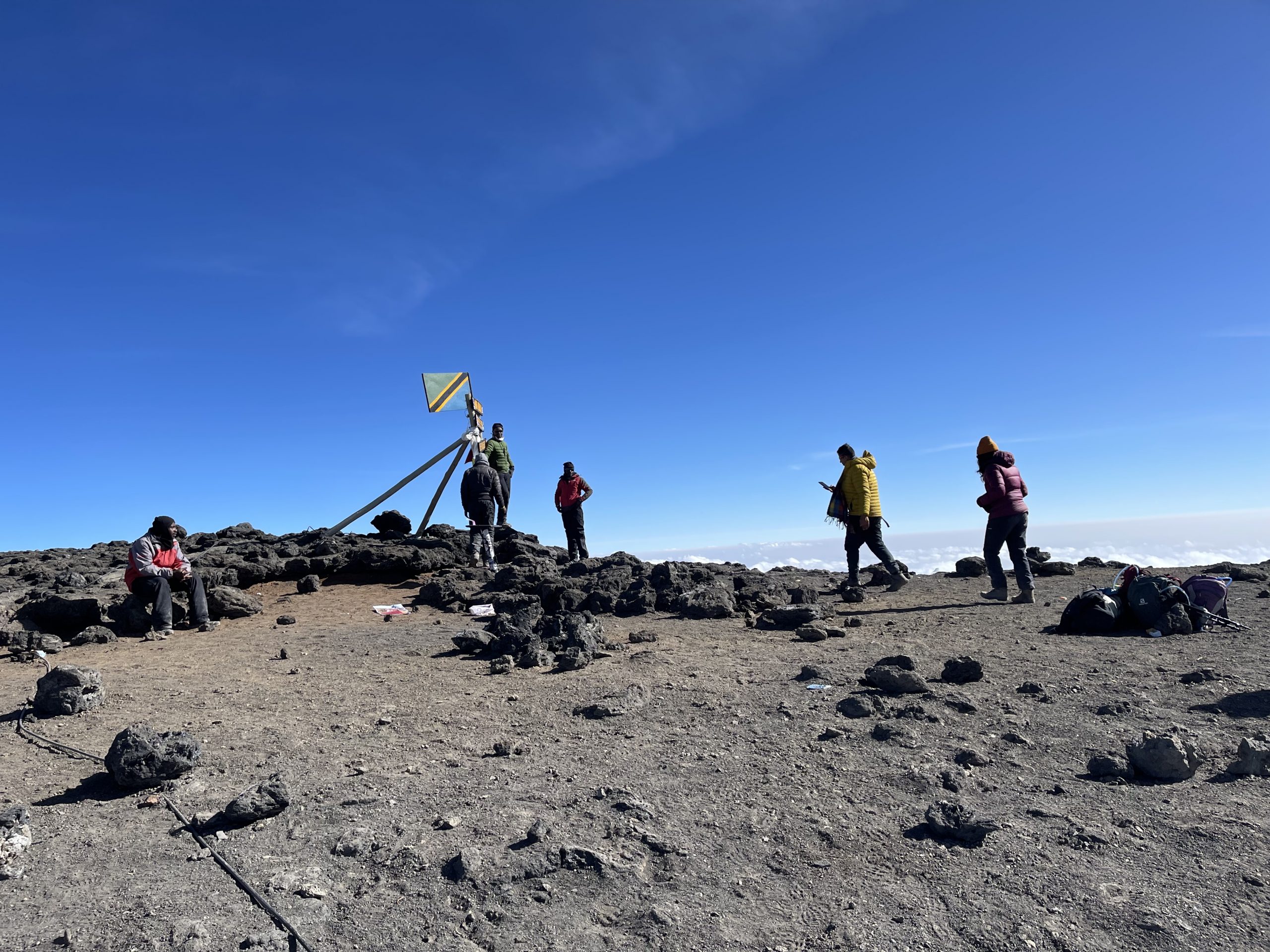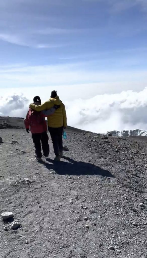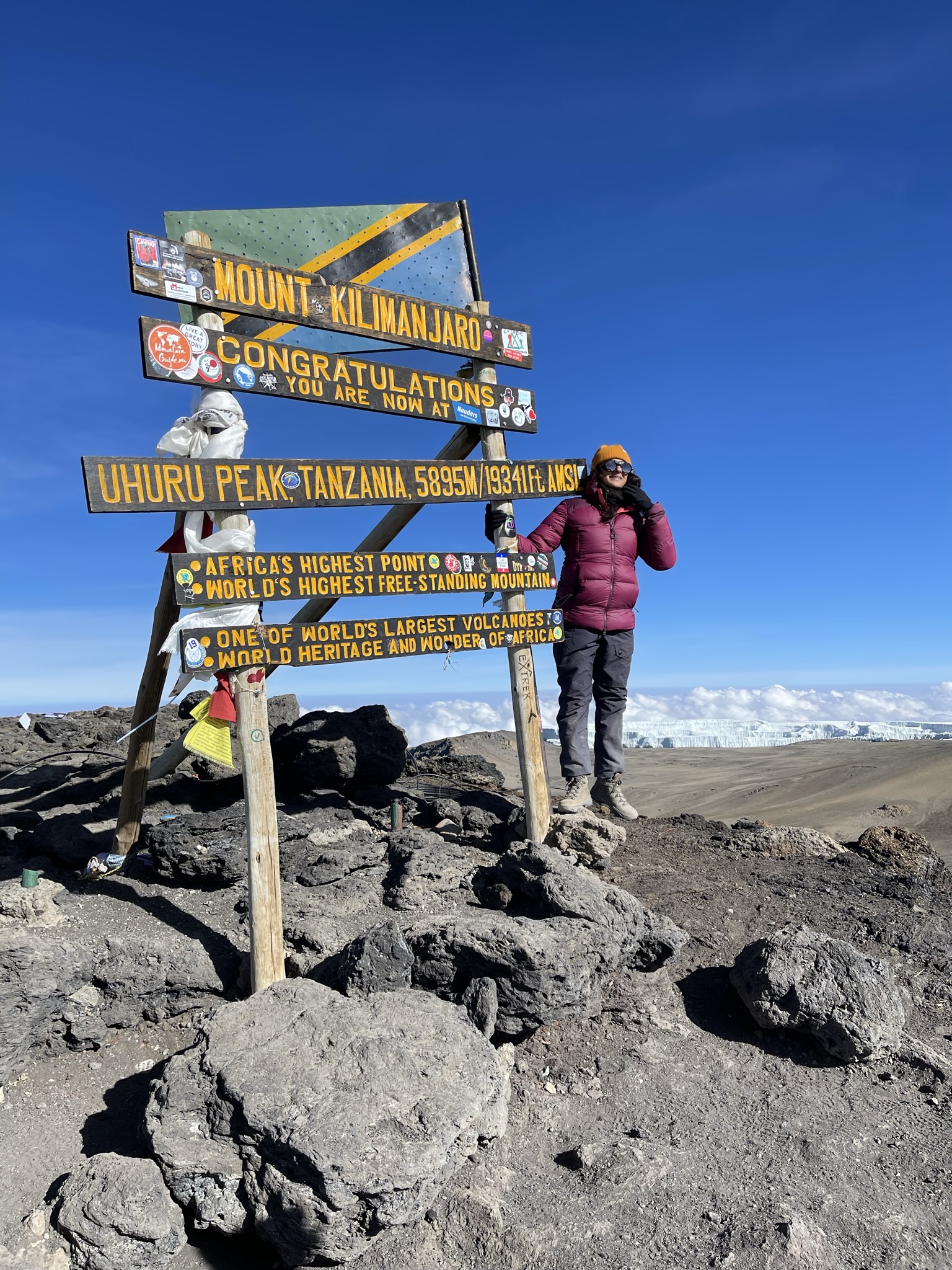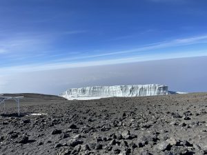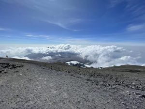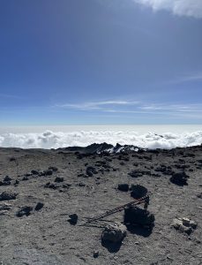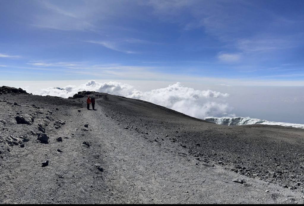 We only wanted to get to Uhuru. Charles advises us to keep going because once we cross that ridge, we will see a board. The Furtwangler Glacier is on our left, and Kibo Crater is on our right. It wasn’t far, but we were unable to accelerate. Each step was challenging. Sid and Emmanuel are by my side during the final stretch. The Uhuru Peak board is visible. I pause, look, and sob tears of joy, accomplishment, triumph, and gratitude for having reached the roof of Arica at 5895 meters at 8:45 in the morning. We suddenly feel better and it is sheer adrenaline that perks our spirits up!