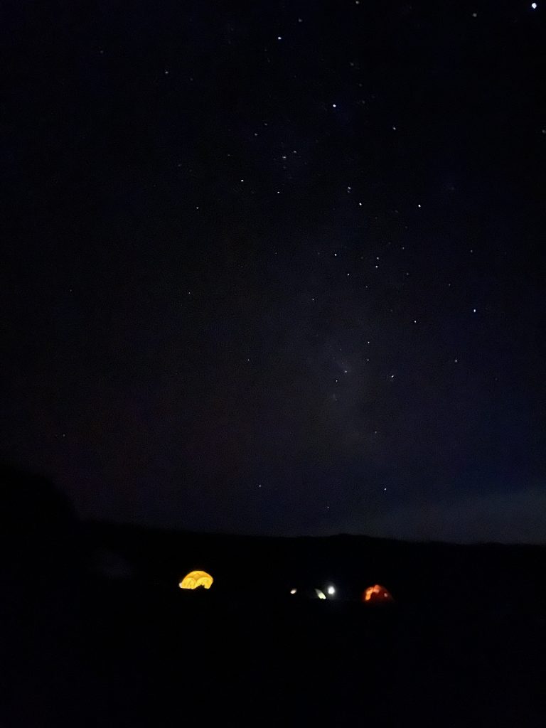 We  trudge Pole Pole , one behind the other, like chameleons. The path and rocks are illuminated by hundreds of head torches. The Kili glow worms are us. This scene would look incredible in an aerial shot. We pass Kosovo camp, which appeared to be fairly nearby during the day. Not that close at all! We start the steep ascent as soon as we pass this camp. An internal voice kept urging me to continue. Trish experienced a moment of dizziness, Sid’s shoes hurt, and he had painfully frozen toes. Some climbers were in excruciating pain and having trouble breathing! People’s breathing was audible to me, and Trish later told me that I was making funny breathing sounds too.